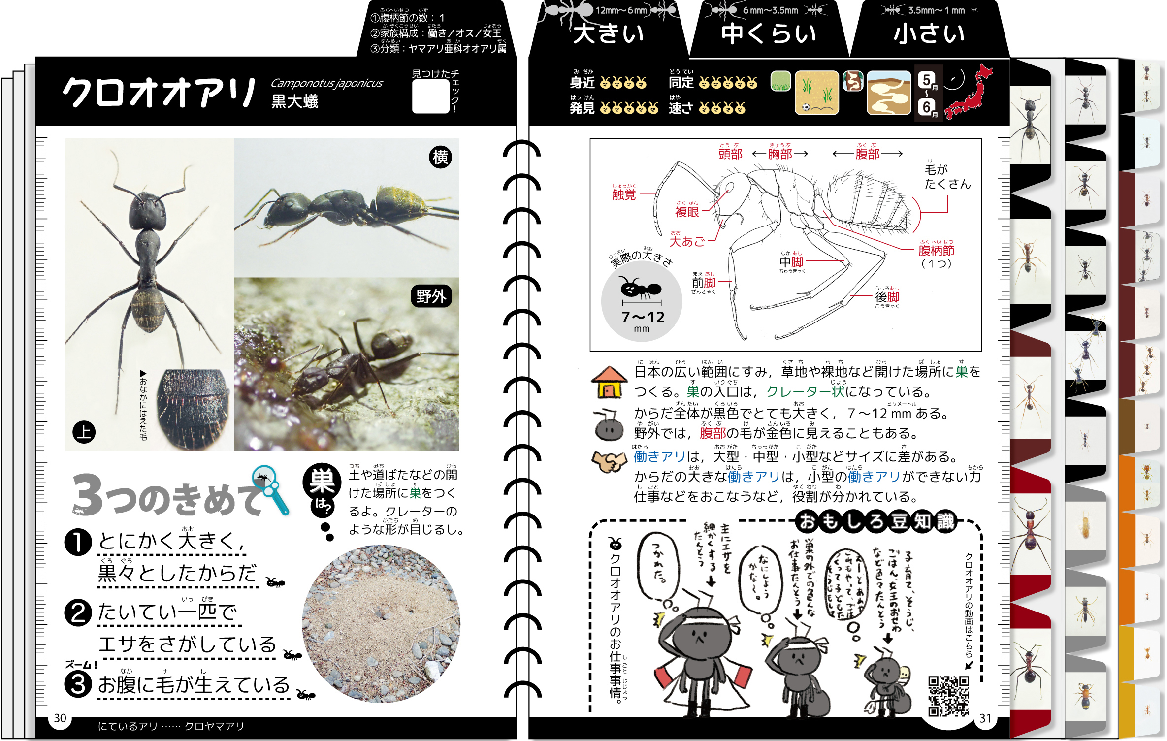 見つけたアリがなんというアリなのかを,図鑑についたインデックスや,「大きさ」「色」「3つのきめて」の特徴からしぼって,かんたんに調べることができます。