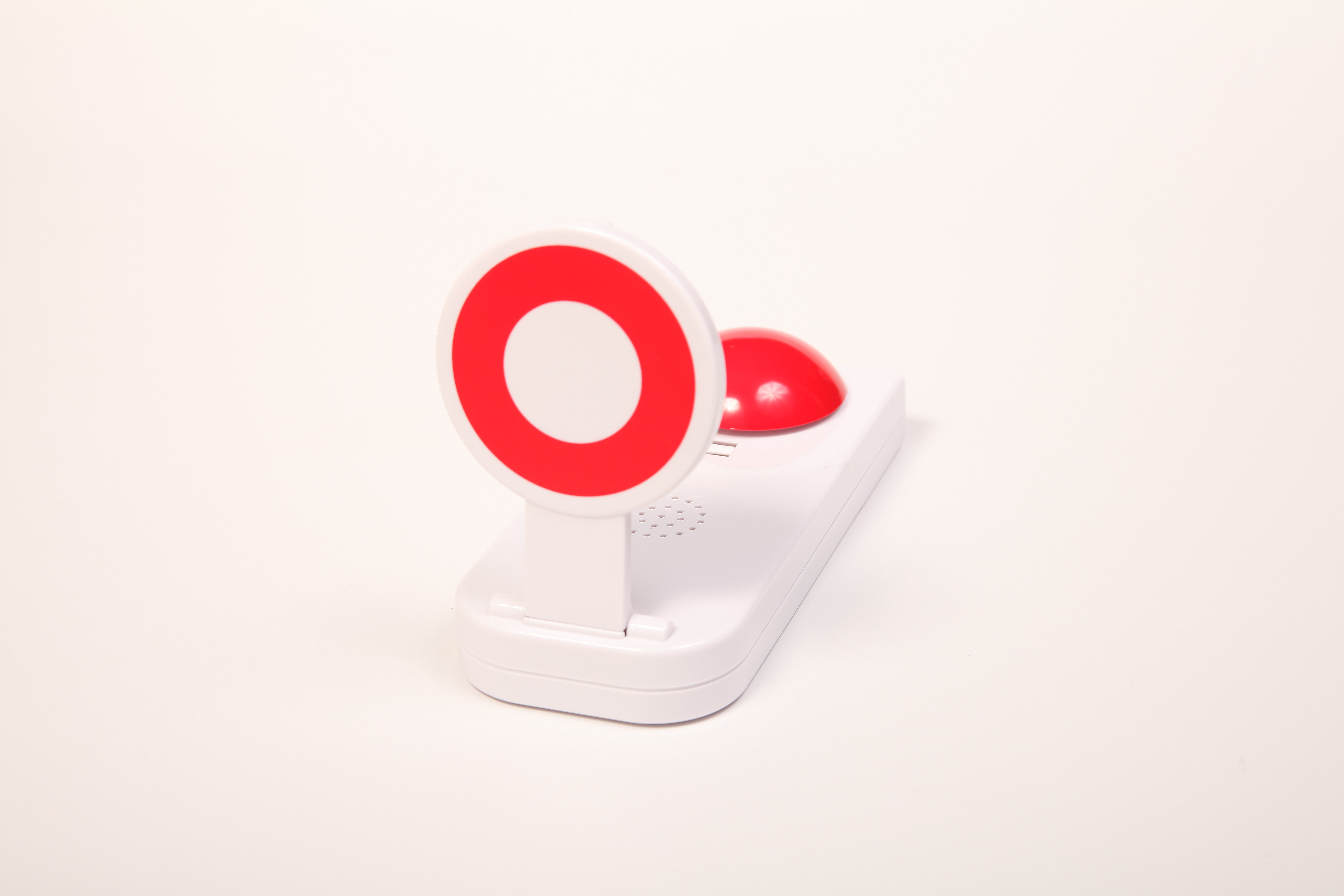 赤いボタンを押すと,「ピンポーン!」の音と共に〇が立ちあがるブザー。