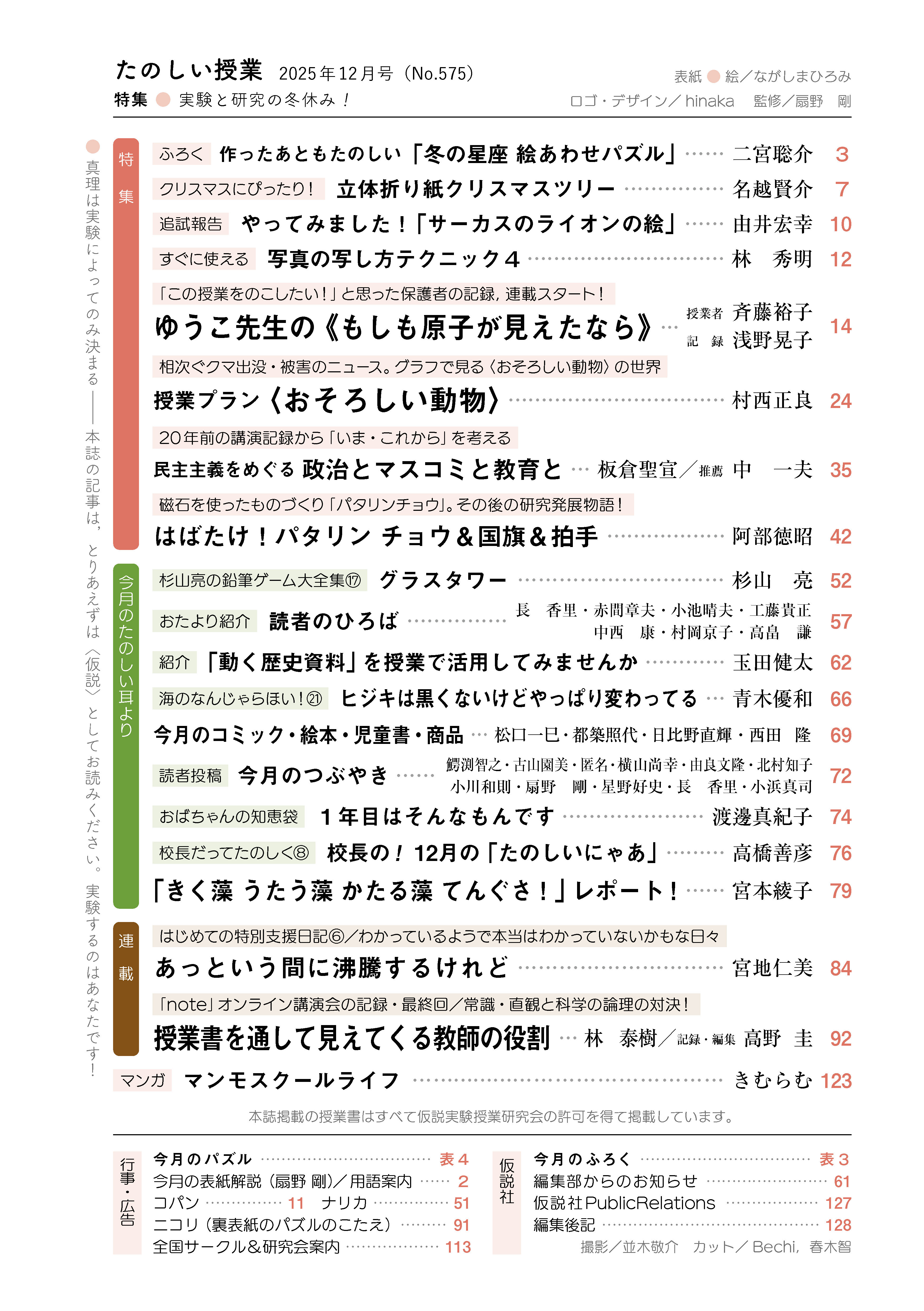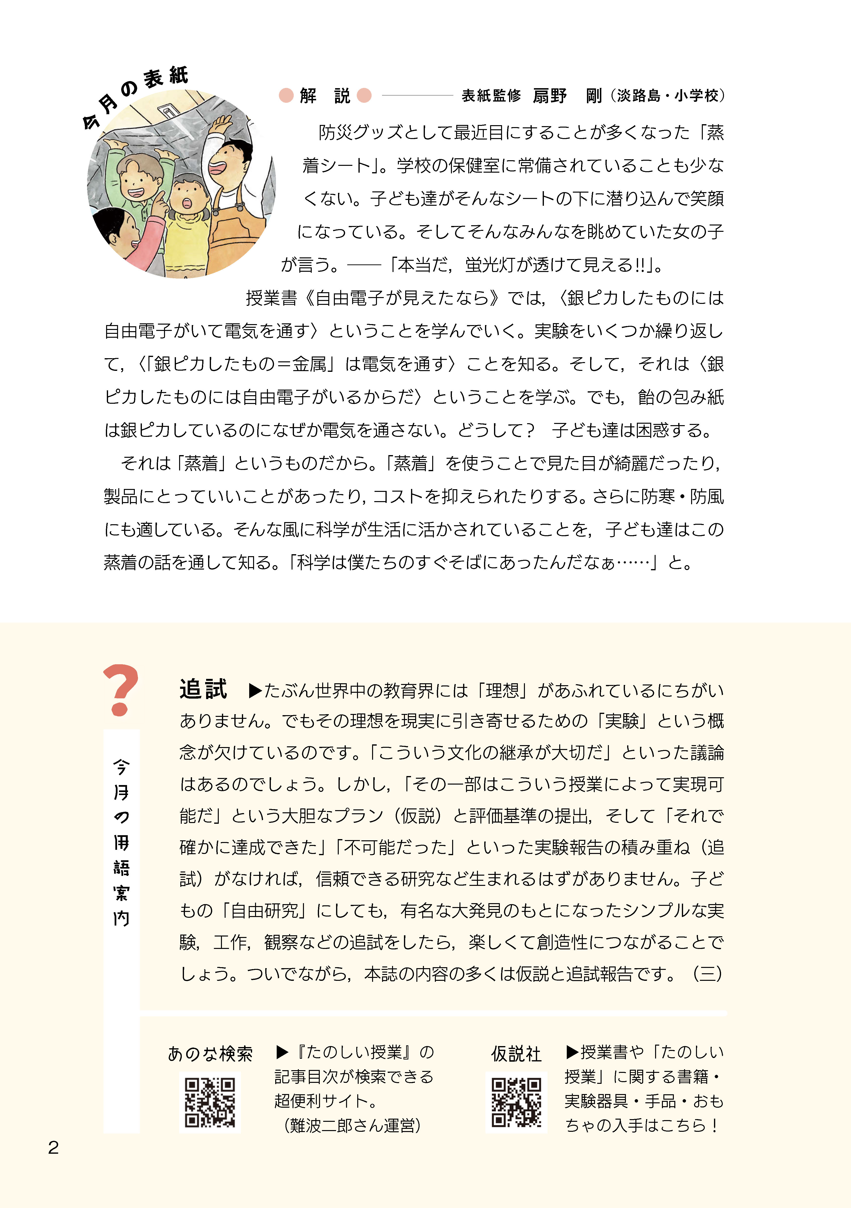 本誌は「明日の元気につながる,学ぶことが楽しくなる雑誌」というテーマのもと,読者のみなさんにもっともっと「たのしい授業」,そして「たのしむ授業」の手立てやヒントをご紹介する教育雑誌です。