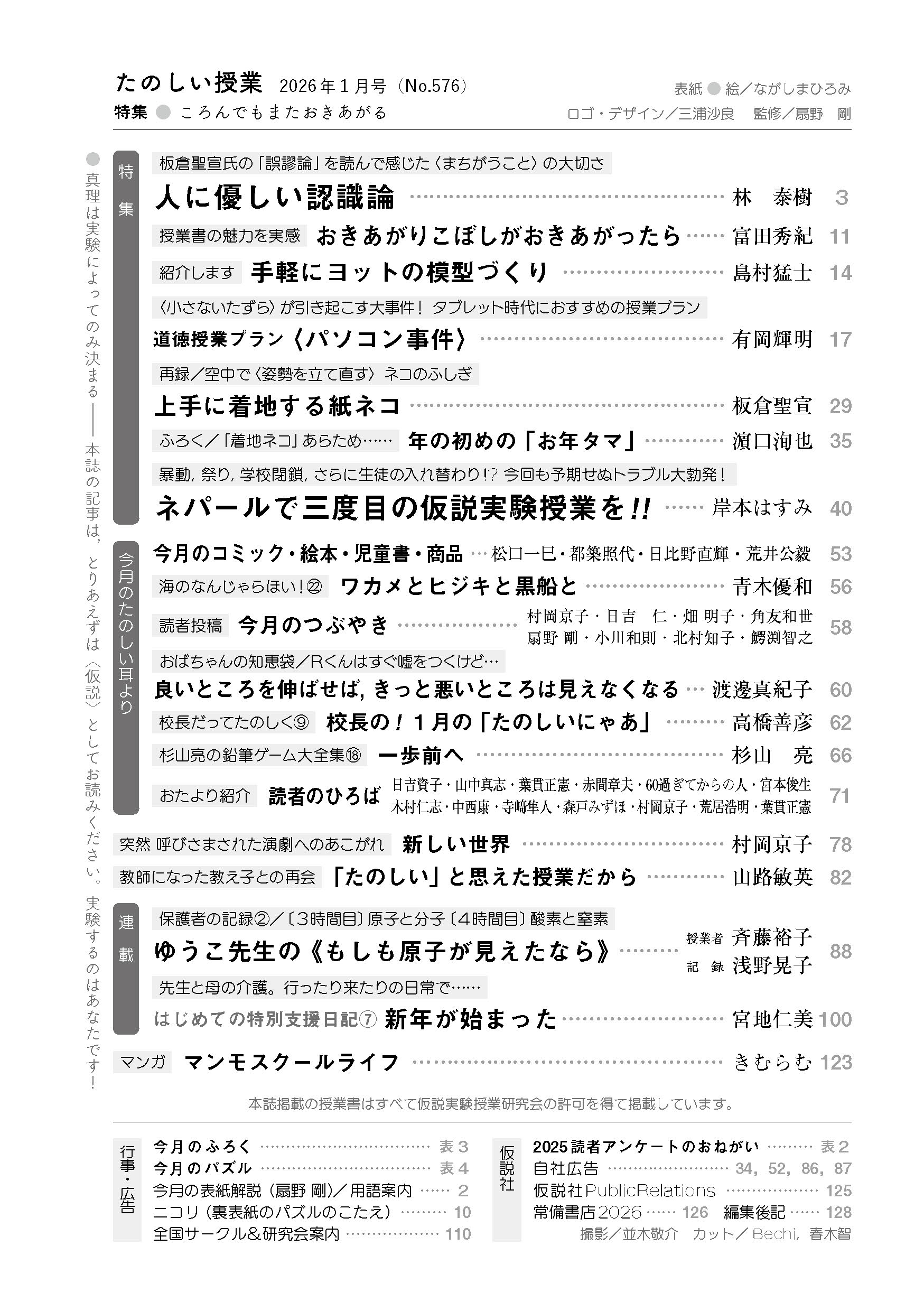 本誌は「明日の元気につながる,学ぶことが楽しくなる雑誌」というテーマのもと,読者のみなさんにもっともっと「たのしい授業」,そして「たのしむ授業」の手立てやヒントをご紹介する教育雑誌です。