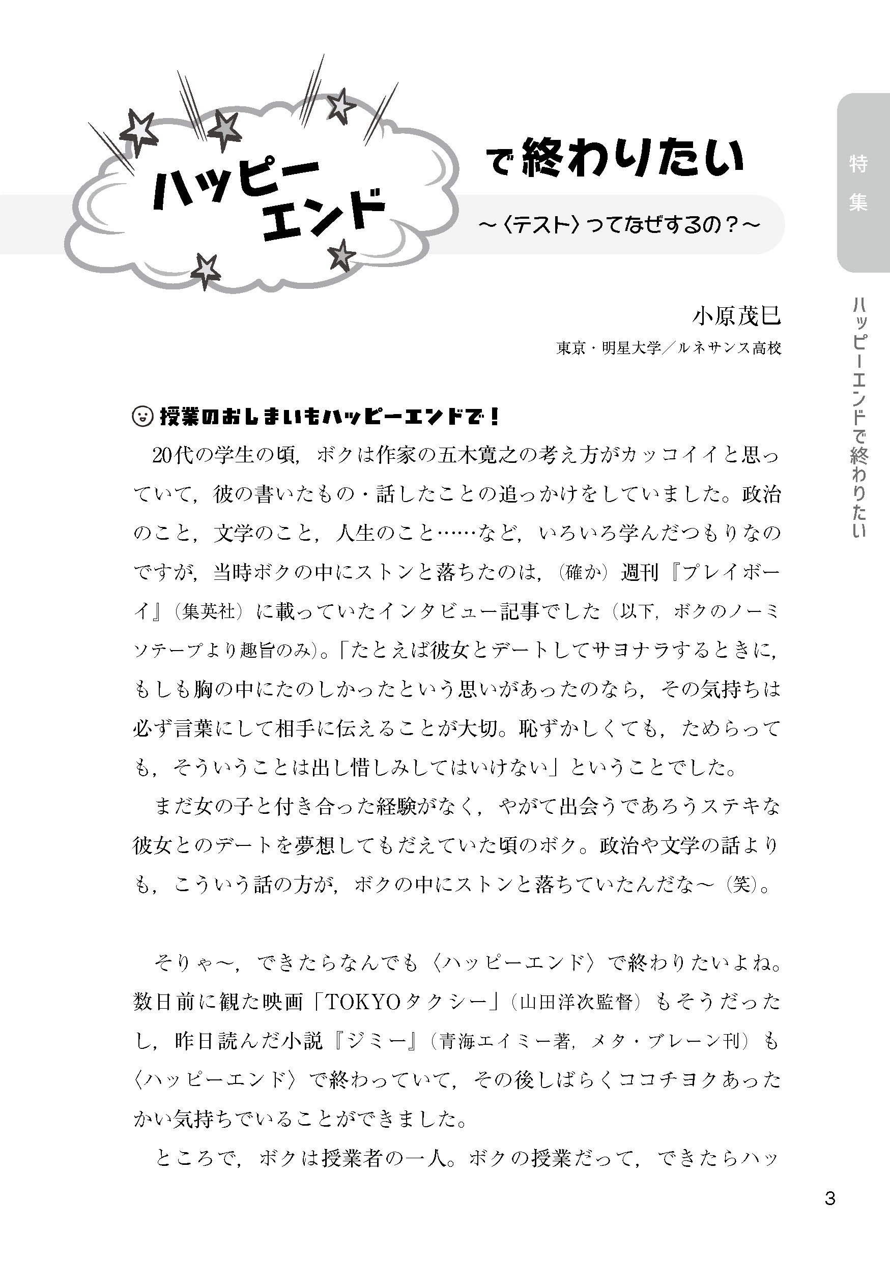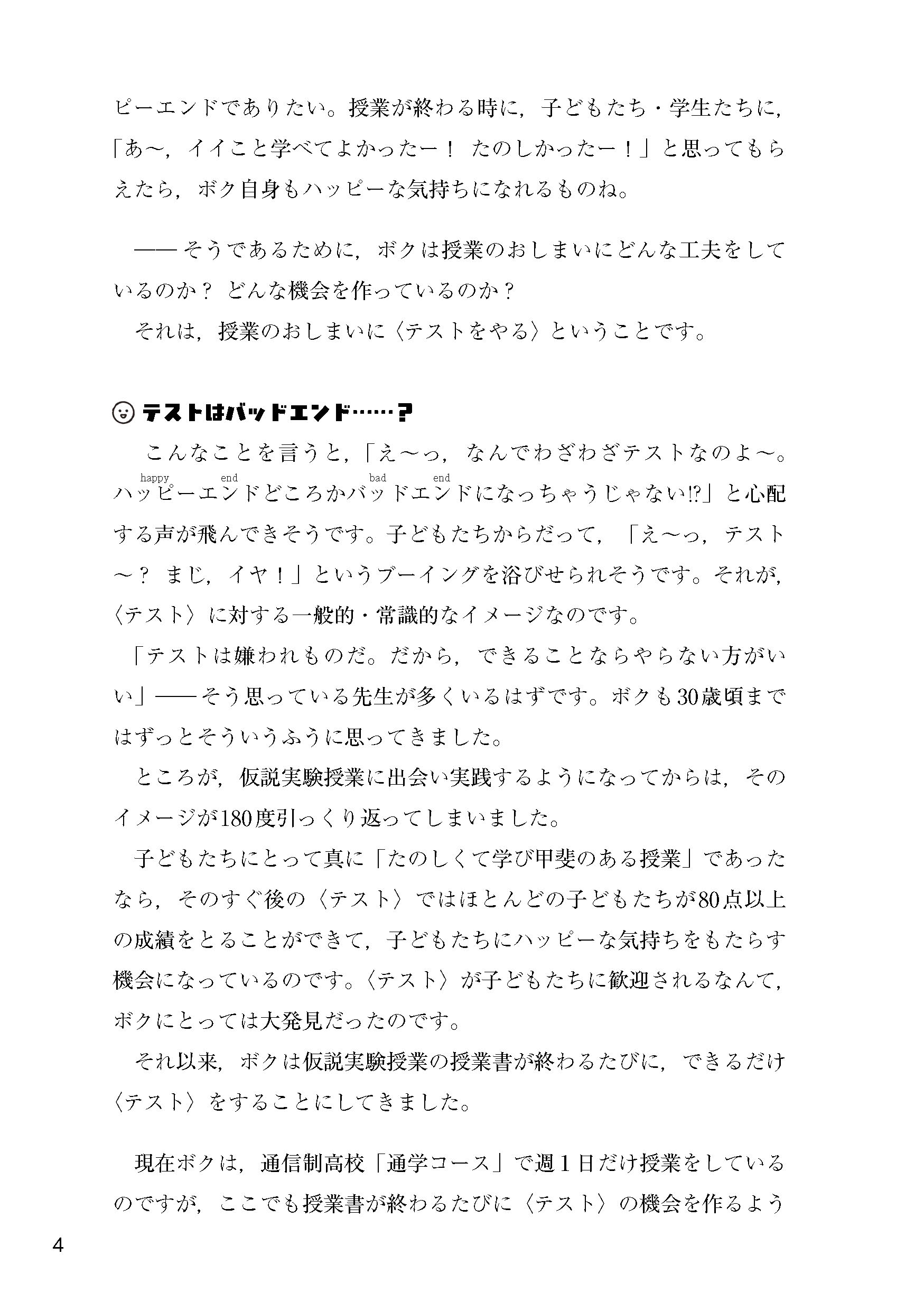 たのしい授業→復習→テストを「ハッピーエンド」で終える工夫や,生徒の声が見えてくる感想文,評価に悩む現場での試行錯誤まで。